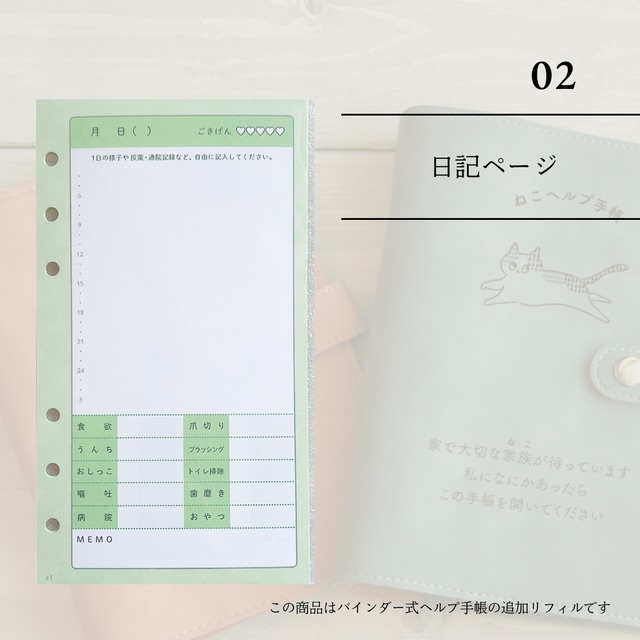 バインダー式ねこヘルプ手帳の、ねこ日記ページの追加パックです。 表裏同じページの15枚セット、30日分です。 ■パック内容 頁 内容(表/裏) 枚数 c1 猫日記ページ 15枚 ■購入する上での注意 このパックに含まれるのは猫日記ページのみです。ヘルプ手帳本体およびその他のページは含まれません。あらかじめご了承ください。