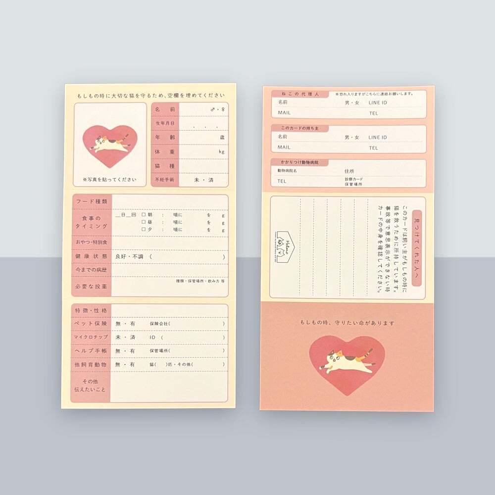 カードを開くと緊急連絡先や、かかりつけ動物病院の連絡先、猫のプロフィールなど、引き継ぎに必要とする情報が書けるようになっています。