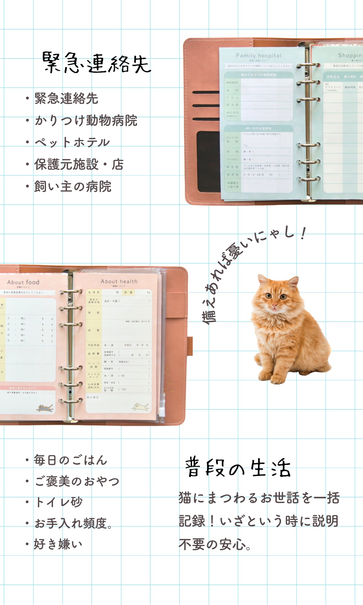 「バインダー式ねこヘルプ手帳」は、いつかの大切な猫を守るために作られた「猫専用の母子手帳」です。
